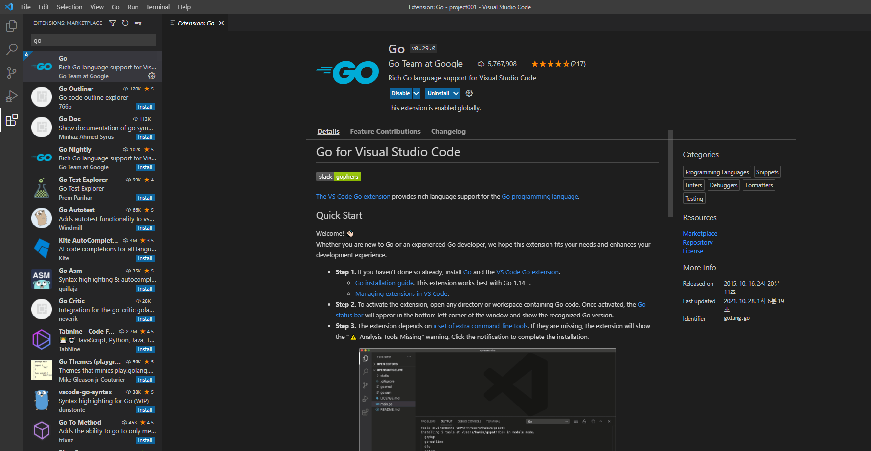 아래와 같이 Go관련 내용이 나오면 성공입니다.
