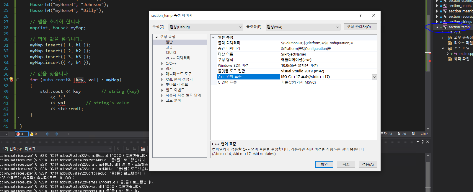 C++ 17은 비쥬얼 스튜디오의 경우 프로젝트에 마우스 우클릭후 설정에서 변경가능하며