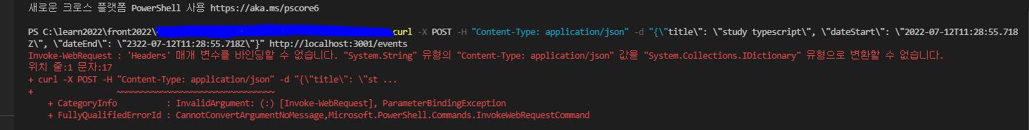 "Invoke-WebRequest : 'Headers' 매개 변수를 바인딩할 수 없습니다. "System.String" 유형의 "Content-Type: application/json" 값을 "System.Collections.IDictionary" 유형으로 변환할 수 없습니다.
