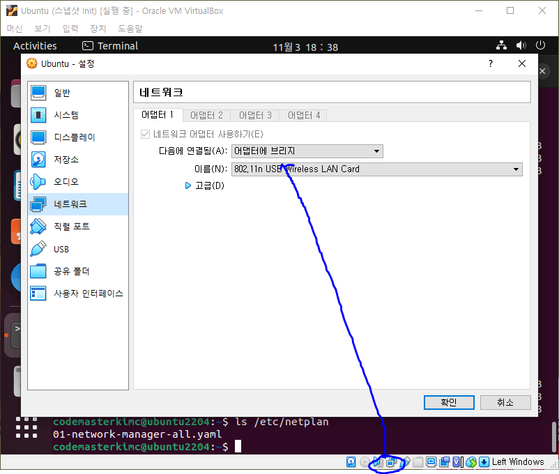 하단에 네트워크 설정을 연 다음 어댑터에 브리지로 설정해줍니다.