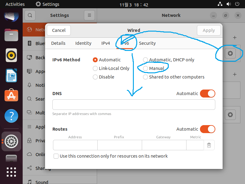 네트워크 값들을 Manual로 해서 입력해주면 됩니다