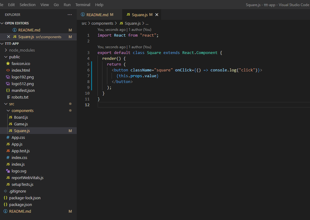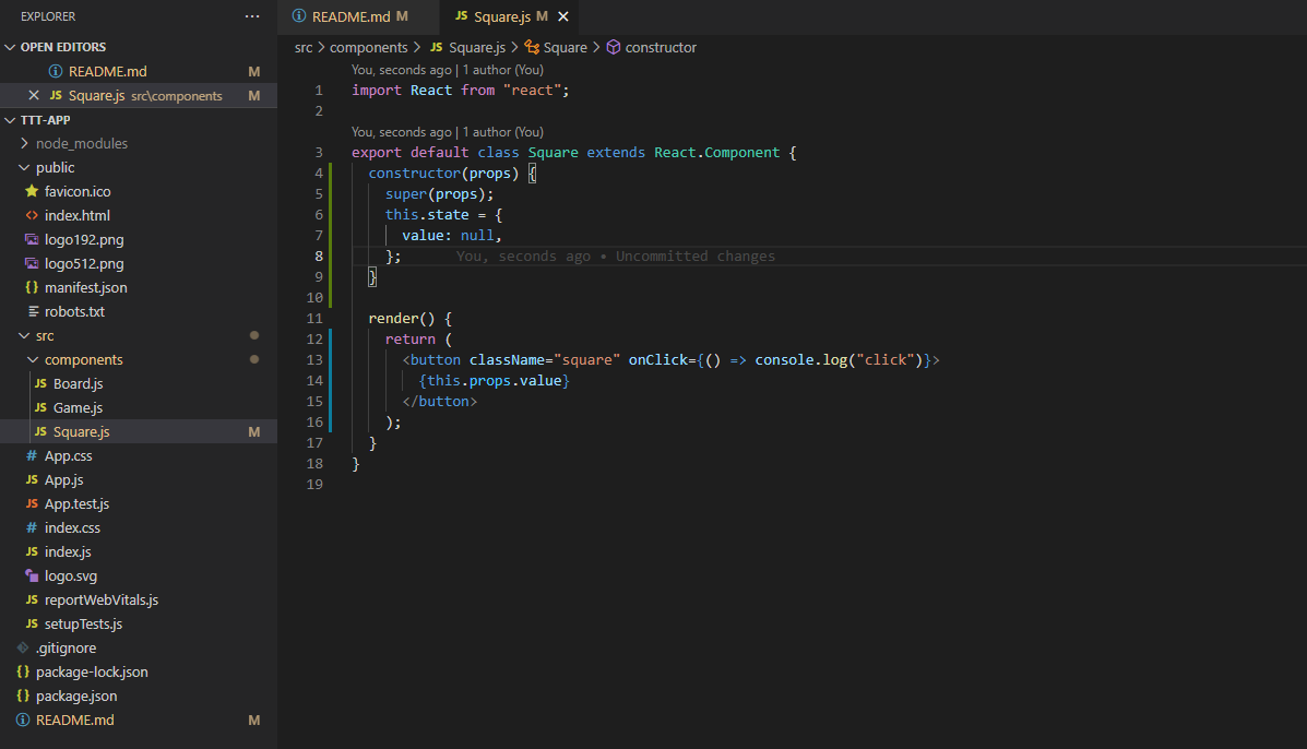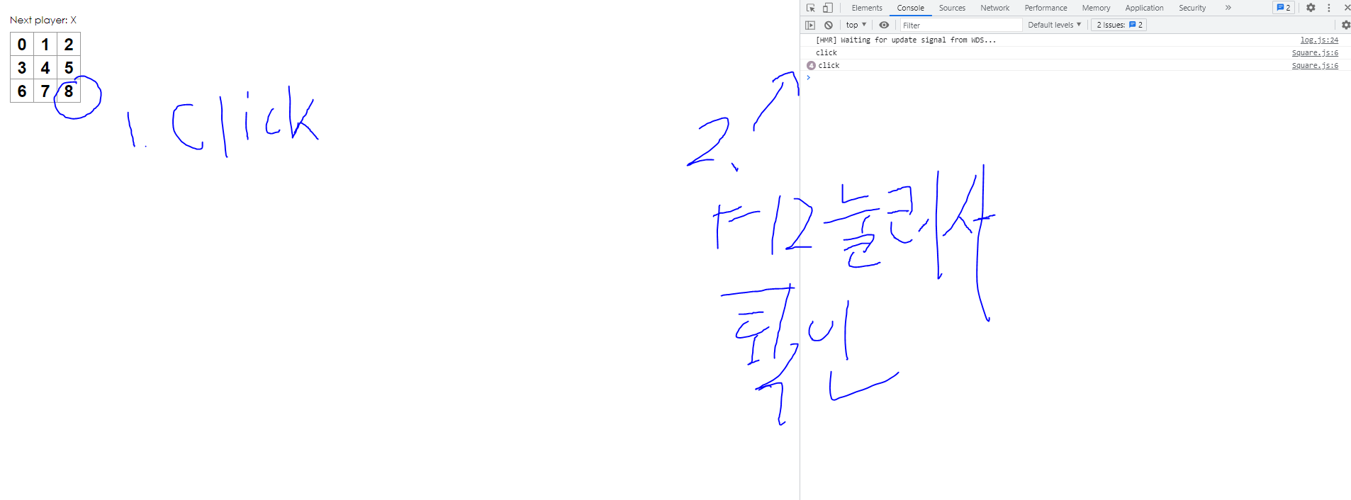 지난 강의에서 보여드린 Square component의 square 클래스를 가진 button에 onClick 함수를 넣어줍니다.