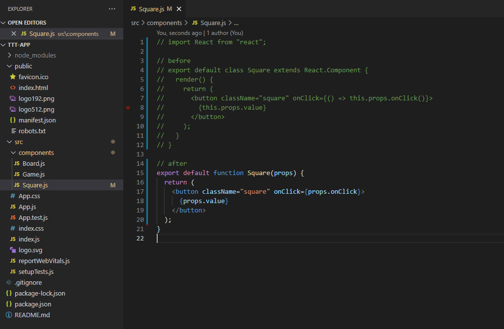 제가 참조하는 리액트 공식 문서 튜토리얼에서는 Square 클래스를 함수로 변경하기에