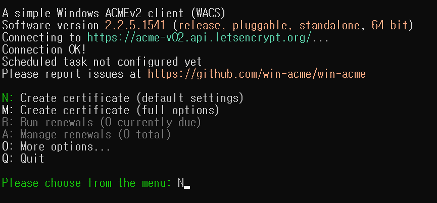 wacs.exe 관리자 권한으로 실행 및 새인증서 설치 (N)
