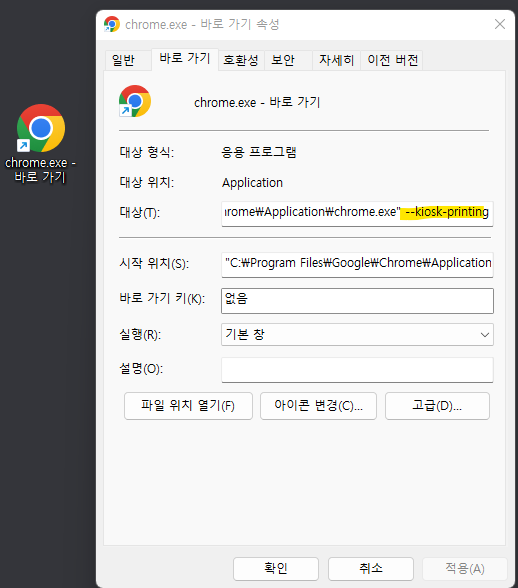 chrome.exe 바로가기 생성 후에 경로 마지막에 아래와 같이 추가