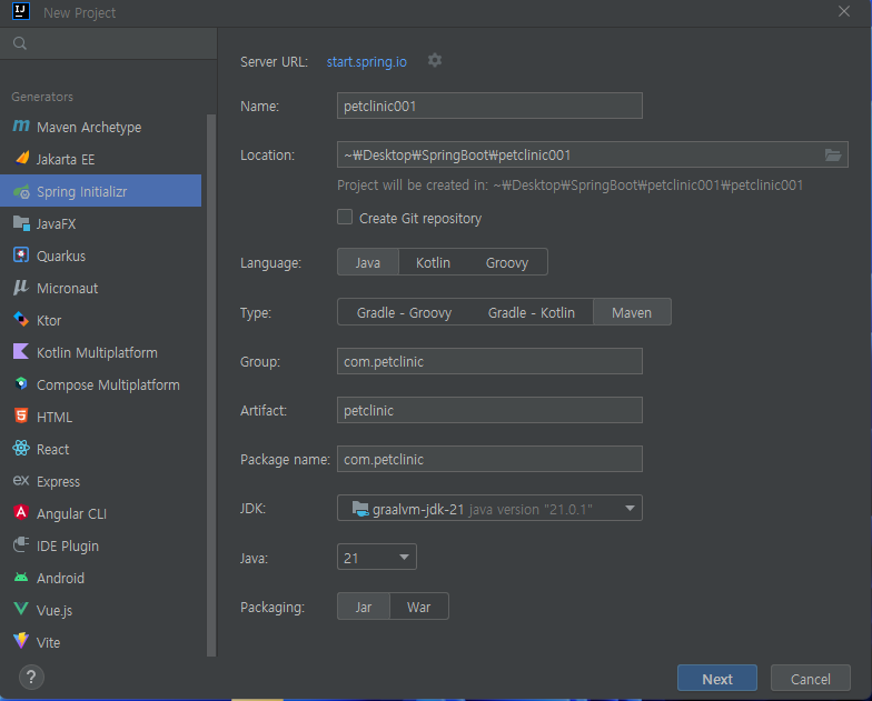 먼저 스프링이니셜라이저를 실행해서 세팅합니다