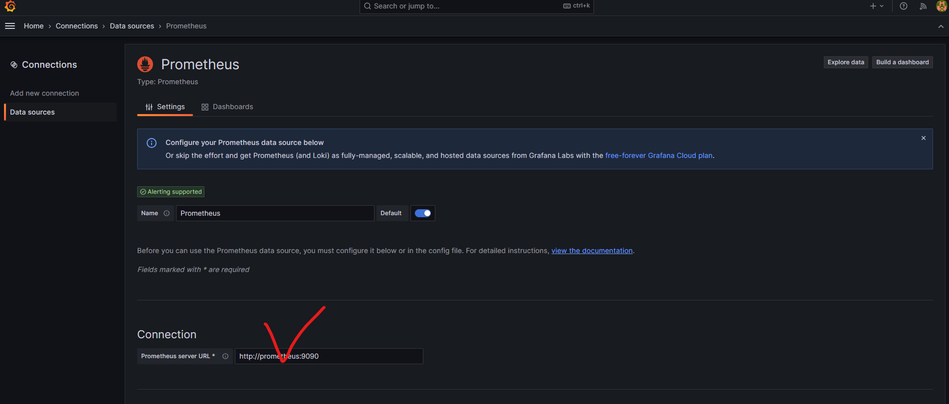 컨테이너에서 접속하는 프로메테우스 주소 입력