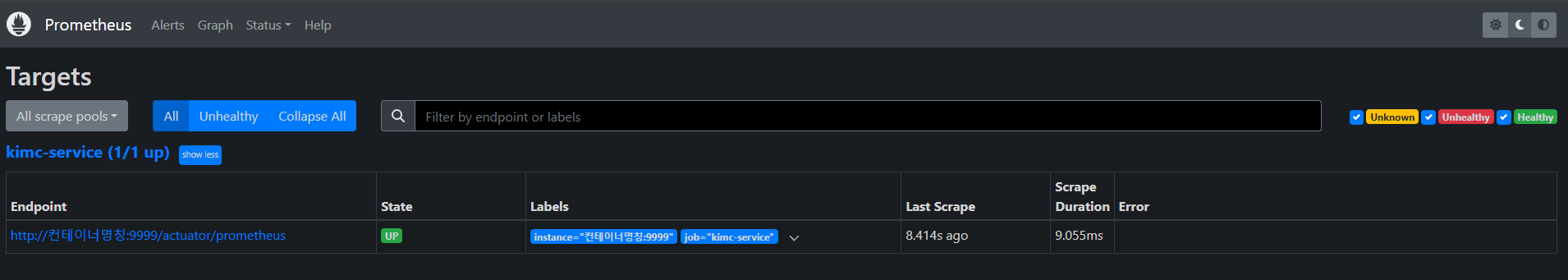 - targets: ['컨테이너명:9999']