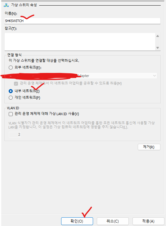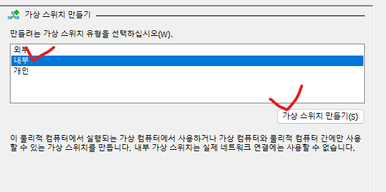 이름을 만들고 내부 네트워크 선택 후에 확인을 누릅니다.