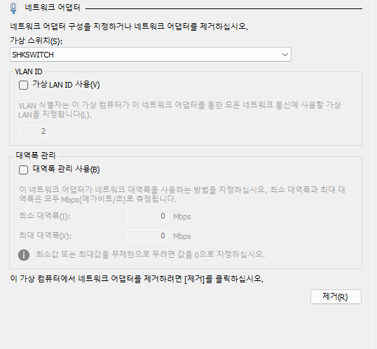 네트워크 어댑터 가상 스위치를 아까 만든 가상 스위치로 변경하면 됩니다.