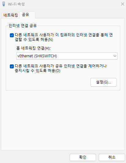 공유에서 다른 네트워크 사용자가 이 컴퓨터의 인터넷 연결을 통해 연결 가능 확인 후에
