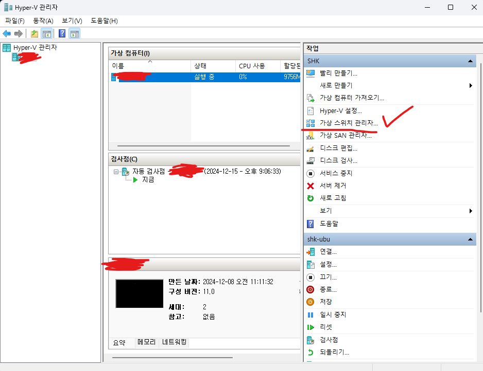 1. Hyper V 관리자 페이지를 열고 -> 가상 스위치 관리자를 엽니다