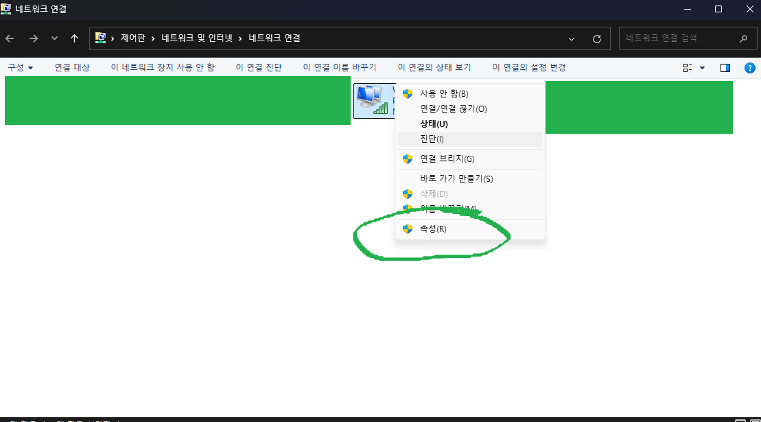 네트워크 연결 -> 연결된 네트워크 어댑터 -> 속성을 누릅니다.