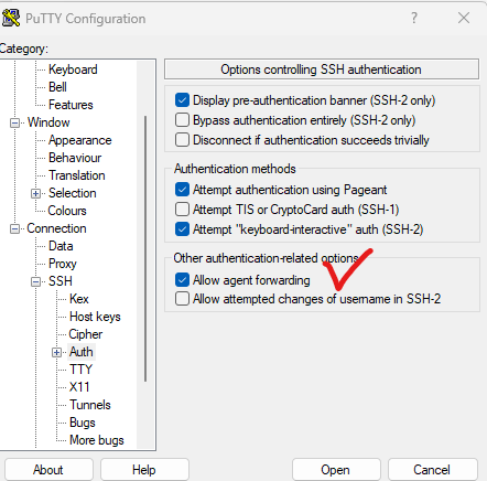 putty에서 Allow Agent Forwarding을 클릭합니다.